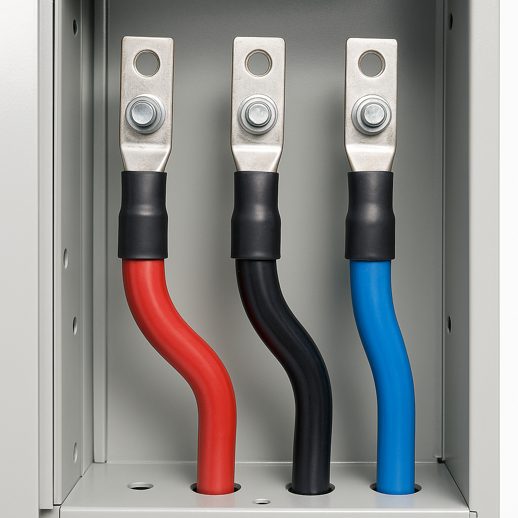 Ensamble de cables de potencia conectados a barras o terminales dentro de celdas metálicas de media tensión, como parte de centros de control de motores (CCM) o switchgears. Incluye conectores de compresión tipo paleta, aislación termocontraíble o con botas aislantes, y fijación con pernos.