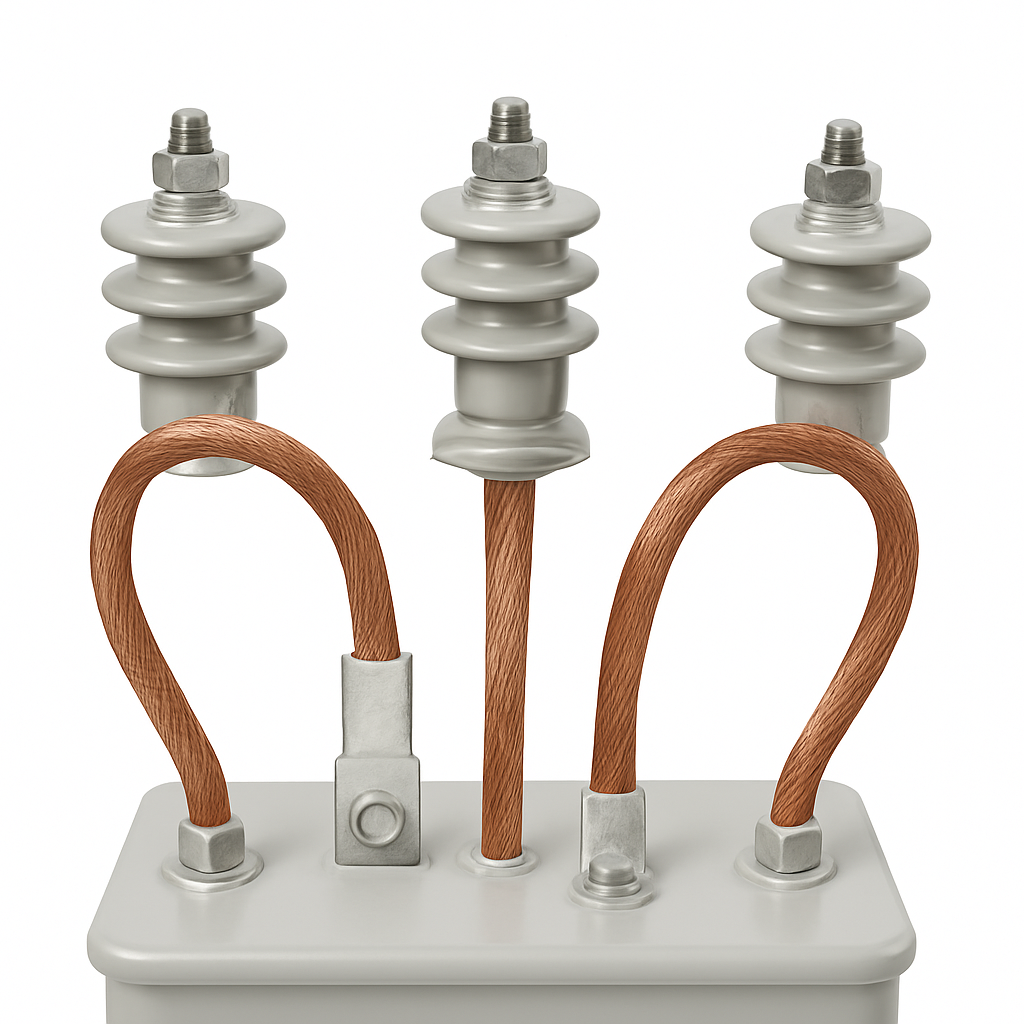 Sistema de conexión de baja tensión en transformadores trifásicos sin derivación de neutro. El montaje muestra tres cables de fase conectados directamente a las bornas o boquillas de porcelana/epoxi, utilizados para alimentación eléctrica en entornos industriales.