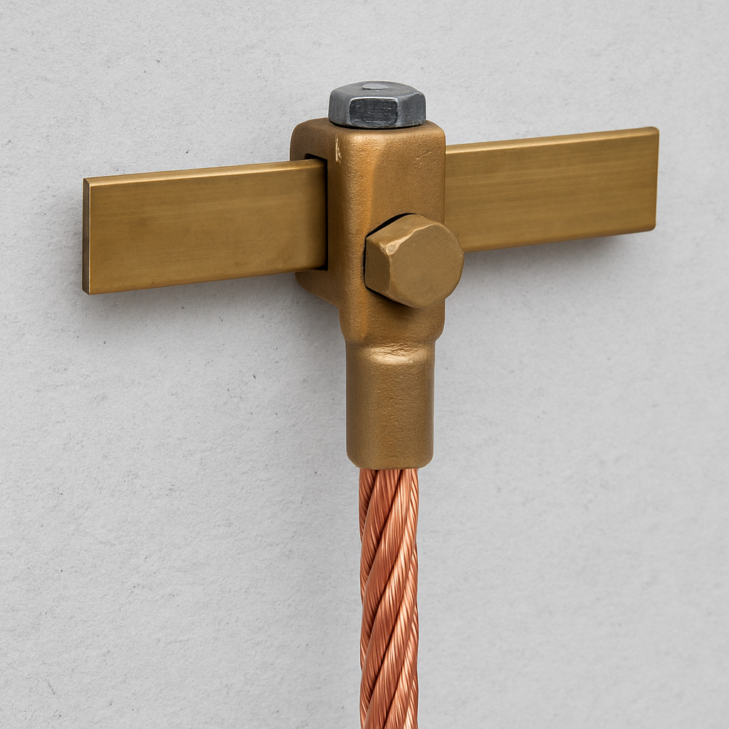 Sistema de fijación de una barra de puesta a tierra (o barra equipotencial) directamente a un muro o estructura metálica. Utiliza soportes aislantes, pernos y conectores que garantizan continuidad eléctrica.