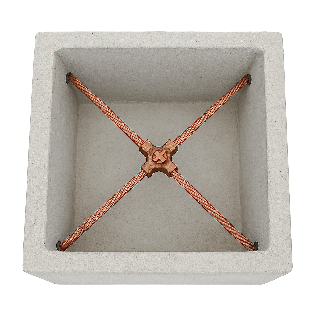 Sistema de conexión de puesta a tierra ubicado dentro de un foso de inspección o derrame, comúnmente utilizado en instalaciones eléctricas industriales para facilitar accesos de mantenimiento y protección. Incluye unión de cables de cobre desnudo mediante una cruceta de bronce o cobre y fijación a muros del foso.